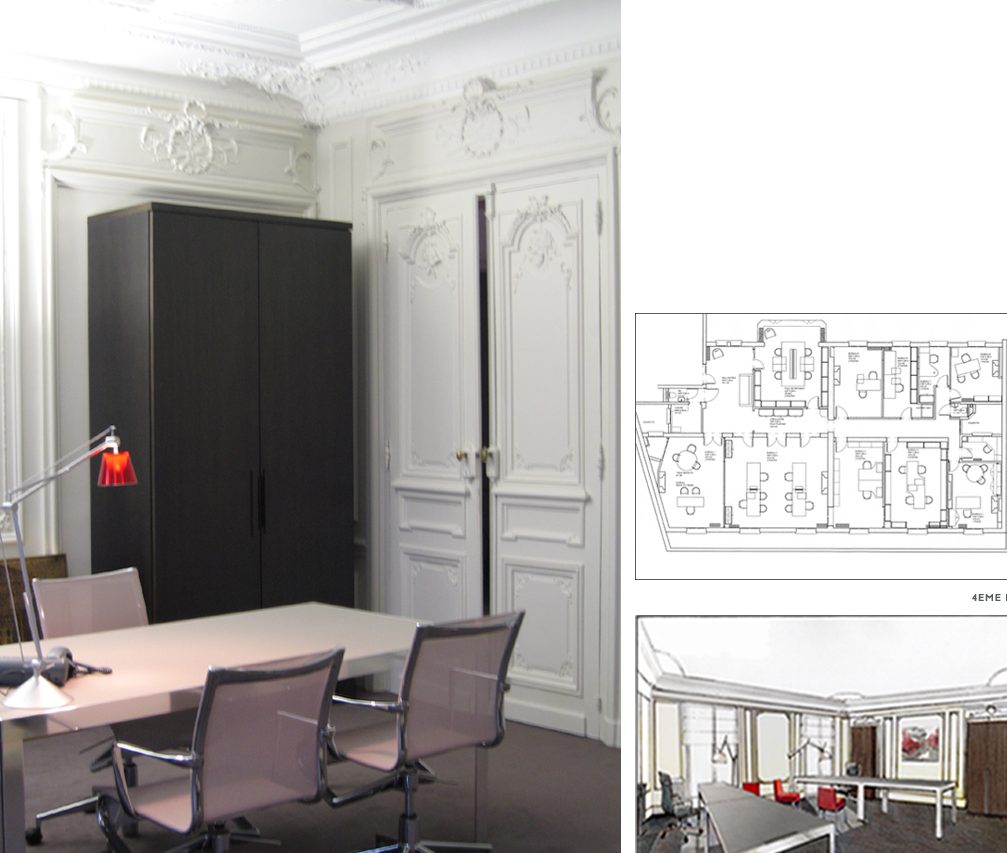 Le cabinet d’avocat Ledoux et Associés, installé sur deux plateaux de bureaux rue Portalis dans le 8e arrondissement, a fait l’acquisition d’un niveau supplémentaire en 2005 pour s’adapter à un développement spectaculaire. Il a confié l’ensemble de la maîtrise d’œuvre à Jean-Pierre Gaignard pour remplir le programme, proposer des implantations, développer la version validée, sélectionner les entreprises et faire le suivi de chantier.