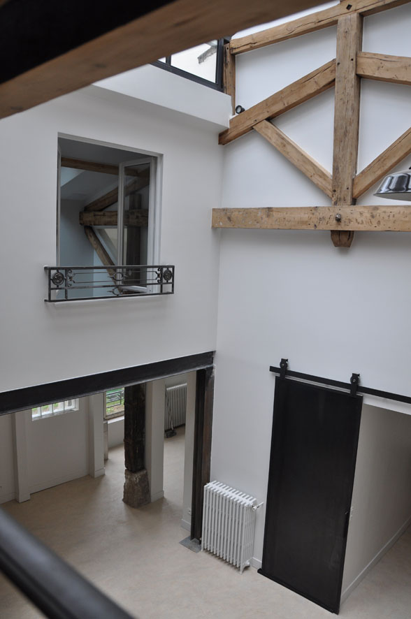 L’éloge du brutalisme industriel Hormis la charpente, l’escalier d’origine et les solides murs porteurs en pierre, le chantier a exigé une réhabilitation quasi totale. Verrière, toiture en zinc, planchers, isolation complète, réseaux (électricité, chauffage, plomberie) : tout a été revu, l’agencement étant toutefois pensé pour rester essentiel et maîtriser un budget serré. Le travail sur la charpente en chêne, marquée par les flammes de l’incendie, est emblématique de cette renaissance. Après vérification structurelle, les poutres ont été soigneusement décapées, participant à l’esthétique finale du lieu.