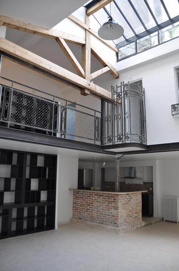 Ancienne tannerie de 300 m2, le lieu, bien que victime d’un incendie puis de rénovations successives et hasardeuses, laissait transparaître un potentiel extraordinaire. Un véritable coup de cœur pour la cliente, une metteuse en scène de théâtre, qui y a immédiatement vu l’écrin idéal pour son double projet : espace de vie intime et lieu de création dynamique.