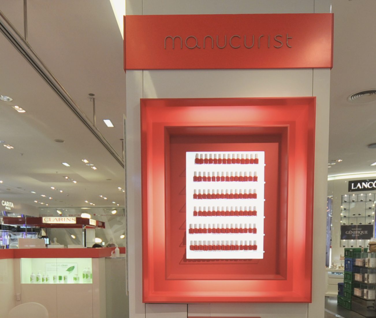 Essentiel à la mise en scène, l’éclairage LED intégré transforme les murs en boîtes lumineuses et chaque flacon de vernis en vedette, tandis que l’affichage rétroéclairé mural sublime l’identité de la marque française. Ce design, à la fois minimaliste et percutant a positionné Manucurist comme un acteur contemporain et premium, invitant à une expérience beauté rapide et lumineuse.